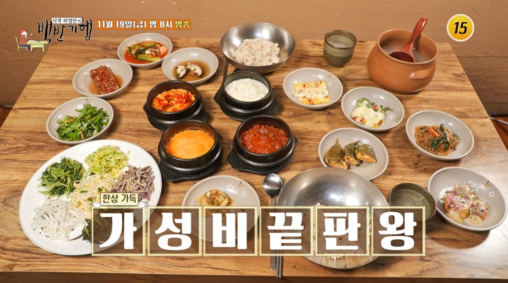식객 허영만과 초대손님으로 나온 과거 책받침 요정 김혜선과 만나 순두부 집을 찾았습니다. 메인메뉴에 앞서 두부깻잎전, 오이채소말이, 가지튀김 등 손이 많이 가는 반찬 열 가지와, 비빔밥용 나물 6종 한 상이 제공되었는데요. 여기에 순두부찌개 2종과 비지찌개, 된장찌개까지 상에 오르자 두 사람은 푸짐함에 놀라 감탄했습니다. 이 밖에도 허영만과 김혜선은 수원 한우 특수부위 가게와 수구레 수육 수구레 전골 가게에도 들렀는데요.